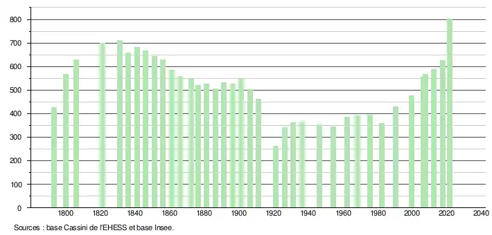 L'évolution du nombre d'habitants est connue à travers les recensements de la population effectués dans la commune depuis 1793. Pour les communes de moins de 10 000 habitants, une enquête de recensement portant sur toute la population est réalisée tous les cinq ans, les populations légales des années intermédiaires étant quant à elles estimées par interpolation ou extrapolation[38]. Pour la commune, le premier recensement exhaustif entrant dans le cadre du nouveau dispositif a été réalisé en 2007[39].