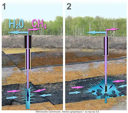 2) par « cavitation » associée au pompage mise en dépression. En bleu : l'eau, en rose : le méthane qui était piégé dans le charbon (gaz de couche)