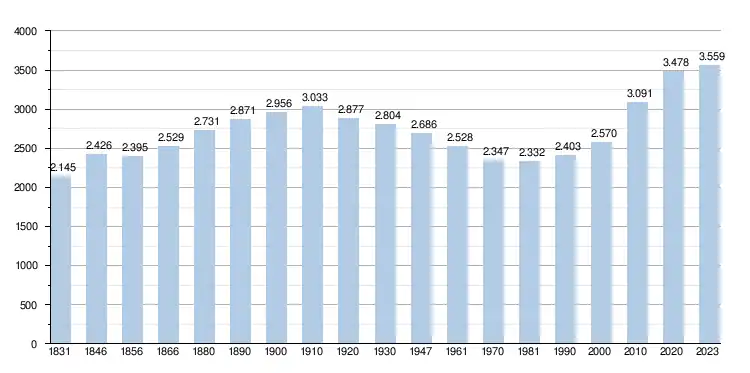 Les chiffres des années 1831 à 1970 tiennent compte des chiffres des anciennes communes fusionnées.
