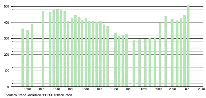 L'évolution du nombre d'habitants est connue à travers les recensements de la population effectués dans la commune depuis 1793. Pour les communes de moins de 10 000 habitants, une enquête de recensement portant sur toute la population est réalisée tous les cinq ans, les populations légales des années intermédiaires étant quant à elles estimées par interpolation ou extrapolation[18]. Pour la commune, le premier recensement exhaustif entrant dans le cadre du nouveau dispositif a été réalisé en 2006[19].