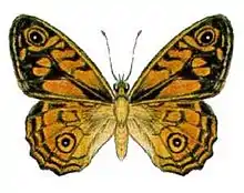 C'est un papillon de taille moyenne, de couleur orange ornementé de marron avec un ocelle noir à l'apex des antérieures et en position anale aux postérieures.