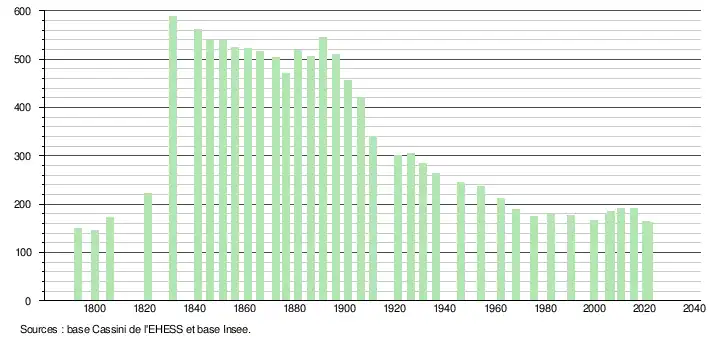 L'évolution du nombre d'habitants est connue à travers les recensements de la population effectués dans la commune depuis 1793. Pour les communes de moins de 10 000 habitants, une enquête de recensement portant sur toute la population est réalisée tous les cinq ans, les populations légales des années intermédiaires étant quant à elles estimées par interpolation ou extrapolation[24]. Pour la commune, le premier recensement exhaustif entrant dans le cadre du nouveau dispositif a été réalisé en 2005[25].