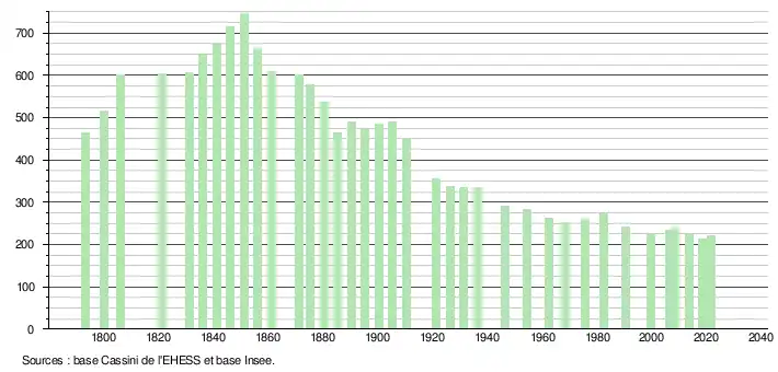 L'évolution du nombre d'habitants est connue à travers les recensements de la population effectués dans la commune depuis 1793. Pour les communes de moins de 10 000 habitants, une enquête de recensement portant sur toute la population est réalisée tous les cinq ans, les populations légales des années intermédiaires étant quant à elles estimées par interpolation ou extrapolation[22]. Pour la commune, le premier recensement exhaustif entrant dans le cadre du nouveau dispositif a été réalisé en 2008[23].