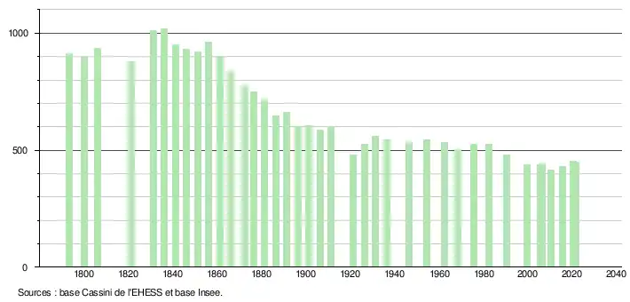 L'évolution du nombre d'habitants est connue à travers les recensements de la population effectués dans la commune depuis 1793. Pour les communes de moins de 10 000 habitants, une enquête de recensement portant sur toute la population est réalisée tous les cinq ans, les populations légales des années intermédiaires étant quant à elles estimées par interpolation ou extrapolation[38]. Pour la commune, le premier recensement exhaustif entrant dans le cadre du nouveau dispositif a été réalisé en 2005[39].
