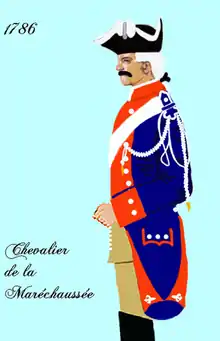 La Gendarmerie nationale[alpha 1] est une des plus anciennes institutions françaises. En effet, elle est l'héritière de la Maréchaussée, corps de militaires qui, chargé de la police et de la justice aux armées depuis le Moyen Âge, devient progressivement une force de police compétente pour l'ensemble de la population sur la quasi-totalité du territoire français[9]. Elle conserve des attributions de justice extraordinaire (dite « prévôtale ») jusqu'à la Révolution[10].