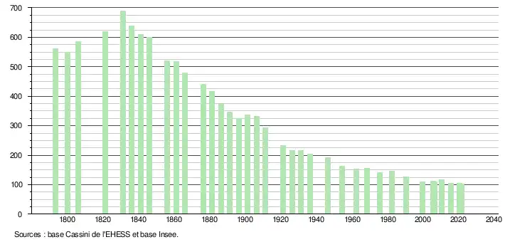 L'évolution du nombre d'habitants est connue à travers les recensements de la population effectués dans la commune depuis 1793. Pour les communes de moins de 10 000 habitants, une enquête de recensement portant sur toute la population est réalisée tous les cinq ans, les populations légales des années intermédiaires étant quant à elles estimées par interpolation ou extrapolation[18]. Pour la commune, le premier recensement exhaustif entrant dans le cadre du nouveau dispositif a été réalisé en 2005[19].