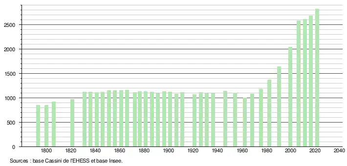 L'évolution du nombre d'habitants est connue à travers les recensements de la population effectués dans la commune depuis 1793. Pour les communes de moins de 10 000 habitants, une enquête de recensement portant sur toute la population est réalisée tous les cinq ans, les populations légales des années intermédiaires étant quant à elles estimées par interpolation ou extrapolation[28]. Pour la commune, le premier recensement exhaustif entrant dans le cadre du nouveau dispositif a été réalisé en 2006[29].