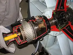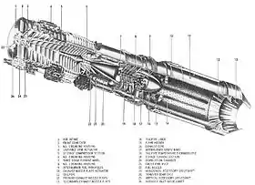 | Chambre de combustion | Plusieurs chambres séparées reliées à l'intérieur d'une plus grande (système « Cannular Combustor ») |
