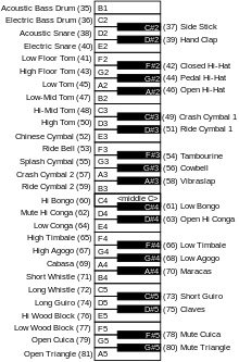 Chaque instrument de percussion est associé à une touche différente (note) du clavier. Si on prend le cas de deux timbales d'orchestre, elles sont accordées différemment et il leur correspondra donc deux numéros différents.