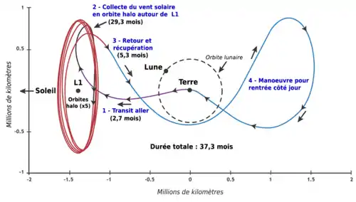 La sonde spatiale Genesis est lancée par une fusée Delta II 7326, le depuis la base de Cap Canaveral, en Floride[27]. Après un transit de 1,5 million de km durant lequel les instruments et équipements de la sonde sont testés[28], Genesis se place le sur une orbite de halo autour du point de Lagrange L1 entre la Terre et le Soleil. Dans cette région de l'espace les attractions terrestre et solaire s'équilibrent[29]. Le la sonde spatiale déploie pour la première fois ses collecteurs et commence à récolter les particules solaires[30]. La sonde effectue cinq révolutions du au , soit durant 884 jours, les différents collecteurs sont exposés au vent solaire. Ils collectent 1020 ions, soit environ 0,4 mg de matière[31].