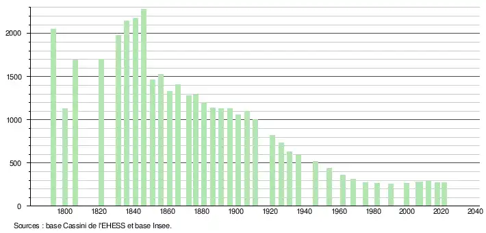 L'évolution du nombre d'habitants est connue à travers les recensements de la population effectués dans la commune depuis 1793. Pour les communes de moins de 10 000 habitants, une enquête de recensement portant sur toute la population est réalisée tous les cinq ans, les populations légales des années intermédiaires étant quant à elles estimées par interpolation ou extrapolation[19]. Pour la commune, le premier recensement exhaustif entrant dans le cadre du nouveau dispositif a été réalisé en 2007[20].