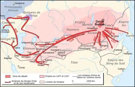 En 1218, il envahit le royaume de Khwarezm[9] ; dès 1220, le Khwarezm est vaincu, la Sogdiane est occupée, en particulier Boukhara et Samarcande[10].