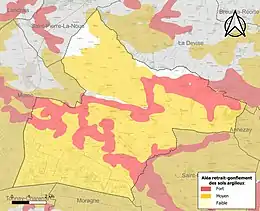 Le retrait-gonflement des sols argileux est susceptible d'engendrer des dommages importants aux bâtiments en cas d’alternance de périodes de sécheresse et de pluie. 94,6 % de la superficie communale est en aléa moyen ou fort (54,2 % au niveau départemental et 48,5 % au niveau national). Sur les 416 bâtiments dénombrés sur la commune en 2019, 405 sont en aléa moyen ou fort, soit 97 %, à comparer aux 57 % au niveau départemental et 54 % au niveau national. Une cartographie de l'exposition du territoire national au retrait gonflement des sols argileux est disponible sur le site du BRGM[13],[Carte 2].