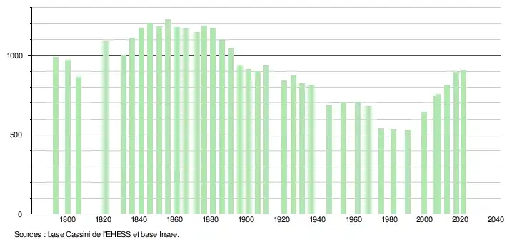 L'évolution du nombre d'habitants est connue à travers les recensements de la population effectués dans la commune depuis 1793. Pour les communes de moins de 10 000 habitants, une enquête de recensement portant sur toute la population est réalisée tous les cinq ans, les populations légales des années intermédiaires étant quant à elles estimées par interpolation ou extrapolation[16]. Pour la commune, le premier recensement exhaustif entrant dans le cadre du nouveau dispositif a été réalisé en 2007[17].