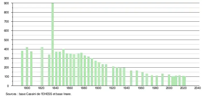 L'évolution du nombre d'habitants est connue à travers les recensements de la population effectués dans la commune depuis 1793. Pour les communes de moins de 10 000 habitants, une enquête de recensement portant sur toute la population est réalisée tous les cinq ans, les populations légales des années intermédiaires étant quant à elles estimées par interpolation ou extrapolation[28]. Pour la commune, le premier recensement exhaustif entrant dans le cadre du nouveau dispositif a été réalisé en 2004[29].