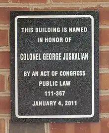 Le , le président Barack Obama signe la résolution de la Chambre no 6392 de la 2e session du 111e Congrès qui nomme le bureau de poste situé au 5003 Westfields Boulevard à Centerville en Virginie : « Colonel George Juskalian Post Office Building »[46],[47]. La cérémonie est célébrée au bureau de poste le même jour à laquelle participent les amis, la famille, les politiciens, les anciens prisonniers de guerre, les anciens combattants et les membres de la communauté arménienne[10]. Parmi les participants figurent le membre du Congrès des États-Unis, Frank Wolf, le délégué de Virginie, Jim LeMunyon (en), et le membre du conseil des superviseurs du comté de Fairfax, Michael Frey[1],[10]. Au cours de la cérémonie, des lettres d'hommage sont lues par l'ancien sénateur John Warner et l'ancien sénateur et candidat à la présidence Bob Dole[3].