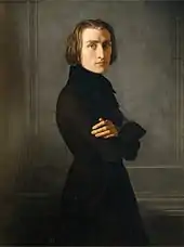 Alfred de Musset présente George Sand à Franz Liszt, compositeur, pianiste virtuose, professeur de musique d'Herminie, la sœur du poète. Franz Liszt est transporté par le mouvement de 1830, influencé par les idées saint-simoniennes et enthousiasmé par Lamennais. La lecture de Leone Leoni, transposition de Manon Lescaut dans le mode romantique, a fait de lui un admirateur de George Sand[105]. Leur relation restera purement amicale. Le célèbre pianiste a un élève de talent, Hermann Cohen, qu'il introduit dans le cercle parisien où se retrouvent écrivains et musiciens. En 1834, George Sand et l'abbé Lamennais font ainsi la connaissance du protégé de Liszt, qui s'accroche à son mentor, et sont tous deux charmés par le jeune garçon[106]. Franz Liszt le surnomme Puzzi, traduction de « mignon » en allemand et la romancière commence à parler de lui comme le mélancolique Puzzi. L'enfant, promis à une brillante carrière artistique, rencontre régulièrement George Sand qui lui prodigue beaucoup d'affection et le considère comme un second fils[106].
