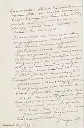 George Sand entreprend les procédures judiciaires à l'encontre de son mari, Casimir Dudevant. Les rapports entre les époux se sont envenimés à cause du train de vie dispendieux de Casimir qui s'est engagé dans des opérations hasardeuses. George Sand craint à juste titre, qu'il ne provoque sa ruine. Des amis lui recommandent le célèbre avocat républicain Louis Michel, pour plaider sa séparation définitive avec le baron Dudevant. L'avocat, plus connu sous le pseudonyme de sa ville, Michel de Bourges, est doué d'un grand talent oratoire et intervient dans les procès politiques de la monarchie de Juillet. Le , George Sand le rencontre dans l'ancienne capitale du Berry et lui expose son affaire. Michel venait de lire son roman Lélia et sous le charme de George Sand, lui offre une plaidoirie impressionnante, en arpentant les rues de Bourges toute une nuit. La séduction est réciproque, George Sand le retrouve en mai à Paris et ils deviennent amants[96]. Avec Michel de Bourges commence une double passion, amoureuse et politique. Avec lui, envolée cette « frigidité » imprudemment avouée dans la première édition de Lélia, vite expurgée[97]. Michel convertit également George Sand, déjà sensible aux opinions républicaines, aux idées socialistes[98]. L'engagement de cette dernière est tel que son appartement parisien est transformé en cénacle républicain et par voie de conséquence, sous surveillance policière. Michel gagne le procès en séparation de George Sand, au terme d'une longue procédure, le [99]. Il promet à George Sand de vivre avec elle, mais c'est un homme marié et qui va le rester. En raison de sa peur de sa femme et de la forte personnalité de la romancière, il rompt leur liaison délétère en . Cette séparation douloureuse déstabilise George Sand et les liaisons qui suivent restent sans lendemain : Félicien Mallefille le précepteur de son fils Maurice[96], Charles Didier, ou l'acteur Bocage. Ce dernier lui restera fidèle en amitié.