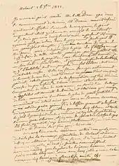 L'abbé Félicité de Lamennais devient le démocrate chrétien qui trouve dans l'Évangile la loi de liberté, d'égalité et de fraternité, loi recueillie par les philosophes et proclamée par la Révolution. Il est excommunié après la parution de son livre Paroles d'un croyant. Lamennais a une grande influence sur Franz Liszt et George Sand[114] qui manifeste son enthousiasme pour ce prêtre dans Histoire de ma vie[115]. Elle lui déclare : « Nous vous comptons parmi nos saints... vous êtes le père de notre Église nouvelle ». Lamennais se fixe à Paris, fonde un journal, Le Monde, auquel George Sand collabore bénévolement. Elle y publie en 1837 Ingres et Calamatta, un article destiné à faire connaître le graveur Luigi Calamatta qui réalise des portraits d'elle et la gravure Une visite aux Catacombes. Puis elle y publie un petit fragment poétique et enfin les célèbres Lettres à Marcie[116]. Dans ces dernières, George Sand exprime ses idées sur le mariage, l'affranchissement de la femme et son égalité avec l'homme[117]. L'audace de cette œuvre a dû effaroucher Lamennais, pour qu'il commente son auteure en ces termes : « Elle ne pardonne pas à saint Paul d'avoir dit : Femmes, obéissez à vos maris ! »[118]. Finalement, la publication s'interrompt lorsque Lamennais abandonne la direction du Monde[119].