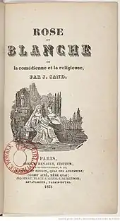 Le roman Rose et Blanche est ébauché par Aurore, mais refait entièrement par Jules Sandeau. L'artiste Alcide-Joseph Lorentz, ami de George Sand, illustre la couverture de ce premier roman[note 7]. L'ouvrage se voit attribuer, par une fantaisie d'Henri de Latouche, le nom d'auteur de Jules Sand[70], qui évoque non seulement Jules Sandeau, mais aussi Karl Sand, l'étudiant bavarois assassin d'August von Kotzebue. Ce livre connaît un certain succès, au point qu'un autre éditeur se présente et commande un prochain roman sous le même nom. Aurore propose le manuscrit d'un livre qu'elle vient d'écrire à Nohant durant l'hiver 1831-1832. Elle veut le donner sous le même pseudonyme mais Jules Sandeau, par modestie, n'accepte pas la paternité d'un livre auquel il est totalement étranger. Henri de Latouche est consulté et tranche par un compromis : le nom de Sand est conservé pour satisfaire l'éditeur et le prénom est modifié pour distinguer les deux auteurs. Aurore prend celui de George, qui lui semble « synonyme de Berrichon »[71]. Étymologiquement, George signifie en effet « celui qui travaille la terre »[72]. Sans le s final du prénom, elle joue sur l'ambiguïté et l'androgynie[73]. Sa première œuvre personnelle, Indiana, est publiée le sous le nom de G. Sand et tous ses romans ultérieurs le seront sous le pseudonyme de George Sand qu'elle adopte définitivement.