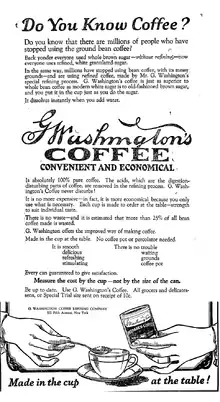 Les publicités sur son café instantané mettaient surtout l'accent sur son côté pratique, sa modernité et sa pureté. Il était censé faciliter la digestion et on disait même que ce café « pur » n'avait pas l'effet insomniant du café moulu. Il expliquait dans ses publicités que son procédé de fabrication n'extrayait pas les « acides » alors qu'on savait depuis 1819 que le pouvoir stimulant du café est dû à une base xanthique, la caféine, qui est évidemment extraite par le procédé de Washington.