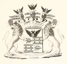 25. Armes publiées dans le Xe volume (1836) de l'Armorial général de la noblesse de l'Empire russe, cote 16. Description (Rietstap, Armorial général, T1, page 364): reprise des armes et de la devise paternelles,avec adjonction d'une couronne comtale (sommée de l'aigle impériale) et d'un chef d'or chargé d'une demi-aigle bicéphale éployée et issante de sable, becquée d'or, chaque tête ceinte d'une couronne impériale d'or ; l'aigle portant sur la poitrine un ruban d'azur orné d'un écusson d'azur orlé d'or, surchargé du chiffre impérial (très rare marque de l'amitié du prince à son sujet et ami).