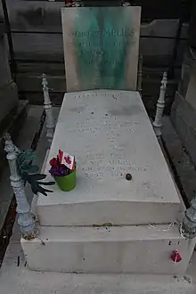 Méliès meurt d'un cancer le , à l’hôpital Léopold-Bellan au 19-21 rue Vercingétorix à Paris. Il repose au cimetière du Père-Lachaise (64e division), dans la même ville[37]. Sa tombe est ornée d'un buste à l'effigie du cinéaste. En , une campagne de financement participatif est lancée par son arrière arrière-petite-fille, afin de sauver sa tombe[38].