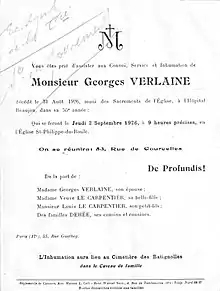 Un dernier mot au sujet de la succession littéraire de mon père : J'entends veiller pieusement aux publications présentes et futures de ses livres. C'est pourquoi, j'ai prié un avocat de Bruxelles, M. Carton de Wiart, de vouloir bien sauvegarder tous mes droits. Vous m'obligeriez beaucoup en publiant celte lettre, Monsieur le Rédacteur en Chef, et je vous prie d'agréer l'assurance de mes sentiments distingués. - Georges Verlaine[27],[28],[17]. »