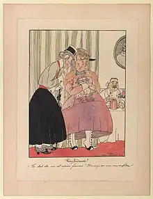 Selon Mathilde Hémard[16], l'artiste réalise de nombreux dessins représentant femmes en train d'attendre le retour de leur mari parti à la guerre. Elles sont généralement montrées en tenue légère laissant percevoir certaines parties du corps, assises ou allongées prenant des poses langoureuses dans des scènes d'intérieures. Dans plusieurs magazine, l'artiste réalise ce genre de dessin comme dans le magazine Fantasio avec Les hommes se battent...les femmes languissent, 1915. Elle représente deux femmes qui pensent à leur mari, et qui pour s'occuper, font de la couture. Dans le même registre, elle réalise Les nuits de Pénélope, 1915 ou Courrier du matin, une lettre du front, 1916 pour La Vie parisienne.