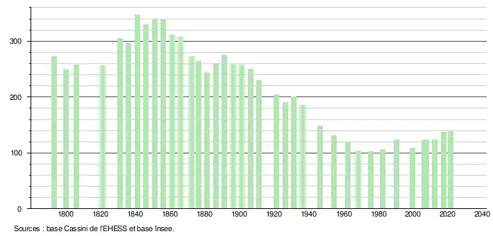 L'évolution du nombre d'habitants est connue à travers les recensements de la population effectués dans la commune depuis 1793. Pour les communes de moins de 10 000 habitants, une enquête de recensement portant sur toute la population est réalisée tous les cinq ans, les populations légales des années intermédiaires étant quant à elles estimées par interpolation ou extrapolation[41]. Pour la commune, le premier recensement exhaustif entrant dans le cadre du nouveau dispositif a été réalisé en 2007[42].
