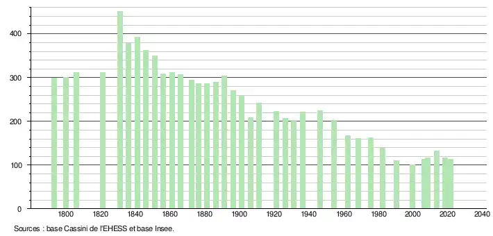 L'évolution du nombre d'habitants est connue à travers les recensements de la population effectués dans la commune depuis 1793. Pour les communes de moins de 10 000 habitants, une enquête de recensement portant sur toute la population est réalisée tous les cinq ans, les populations légales des années intermédiaires étant quant à elles estimées par interpolation ou extrapolation[19]. Pour la commune, le premier recensement exhaustif entrant dans le cadre du nouveau dispositif a été réalisé en 2008[20].