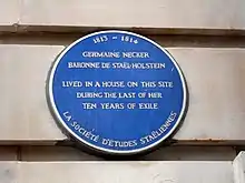 Favorable à la Révolution française et aux idéaux de 1789, elle adopte une position critique dès 1791 et ses idées d'une monarchie constitutionnelle la font considérer comme une opposante gênante par les maîtres de la révolution. Malgré le statut de diplomate de son mari, elle doit se réfugier auprès de son père en Suisse à plusieurs reprises. Interdite de séjour sur le sol français par Napoléon Bonaparte qui la considère comme un obstacle à sa politique, elle s'installe en Suisse dans le château familial de Coppet qui sert de lieu principal de rencontres au groupe du même nom, et d'où elle fait paraître Delphine (1802), Corinne ou l'Italie (1807)[6] et De l'Allemagne (1810/1813[alpha 2]).