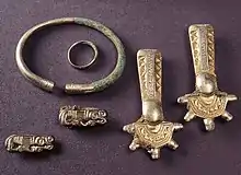 Le monde culturel germanique était relativement pauvre en images. Il a fallu attendre le Ve siècle de notre ère pour que des scènes et des figures de la mythologie soient représentées sur des disques de bijoux en or. À la fin de la période impériale, les fibules ont été adaptées à partir de modèles romains en fonction des formes animales. Les sangliers et les cerfs étaient particulièrement populaires. Des figurines de bétail entièrement en bronze sont également connues, bien que rares. Bien sûr, on ne peut rien dire de la sculpture sur bois. Les imitations d’images animalières romaines ont été développées au fil du temps pour devenir une ornementation animale germanique indépendante.