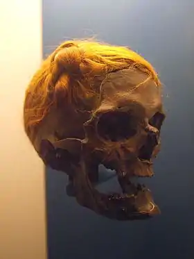 L'Homme d'Osterby, découvert dans une tourbière près d'Osterby, dans le Schleswig-Holstein. Ses cheveux sont attachés en un nœud connu sous le nom de chignon suève.