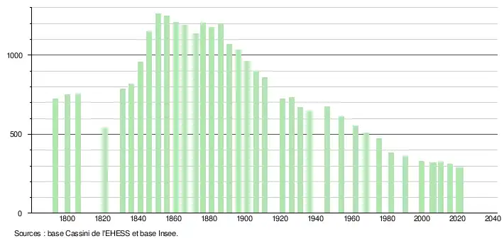 L'évolution du nombre d'habitants est connue à travers les recensements de la population effectués dans la commune depuis 1793. Pour les communes de moins de 10 000 habitants, une enquête de recensement portant sur toute la population est réalisée tous les cinq ans, les populations légales des années intermédiaires étant quant à elles estimées par interpolation ou extrapolation[34]. Pour la commune, le premier recensement exhaustif entrant dans le cadre du nouveau dispositif a été réalisé en 2005[35].
