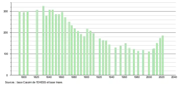 L'évolution du nombre d'habitants est connue à travers les recensements de la population effectués dans la commune depuis 1793. Pour les communes de moins de 10 000 habitants, une enquête de recensement portant sur toute la population est réalisée tous les cinq ans, les populations légales des années intermédiaires étant quant à elles estimées par interpolation ou extrapolation[19]. Pour la commune, le premier recensement exhaustif entrant dans le cadre du nouveau dispositif a été réalisé en 2007[20].
