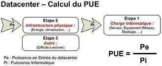 - l'indicateur d'efficacité énergétique ou PUE (Indicateur d'efficacité énergétique)[note 4], qui est le rapport entre la puissance d'entrée et la charge informatique[17] ;