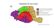 L’alimentation en eau potable à Paris est assurée à parts égales par le prélèvement des eaux souterraines c’est-à-dire provenant des sources et puits, et les eaux dites superficielles issues de la Seine et des rivières[15].