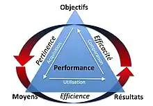 L’application de la performance dans une organisation est une méthode permettant d’atteindre les objectifs organisationnels en réalisant des produits et services de qualité à partir des justes ressources. Cette trinité à tempérance variable fait en sorte que le mouvement d'un seul axe doit s'équilibrer sur les deux autres en tout temps: l'ajout de nouveaux objectifs doit faire réviser les ressources disponibles ainsi que les produits et services livrés; le retrait de ressources doit vérifier les impacts sur l'atteinte des objectifs et des produits et services produits; etc. Il est dès lors important de toujours évaluer la performance sur ses trois axes, soit la pertinence, l'efficience et l'efficacité.