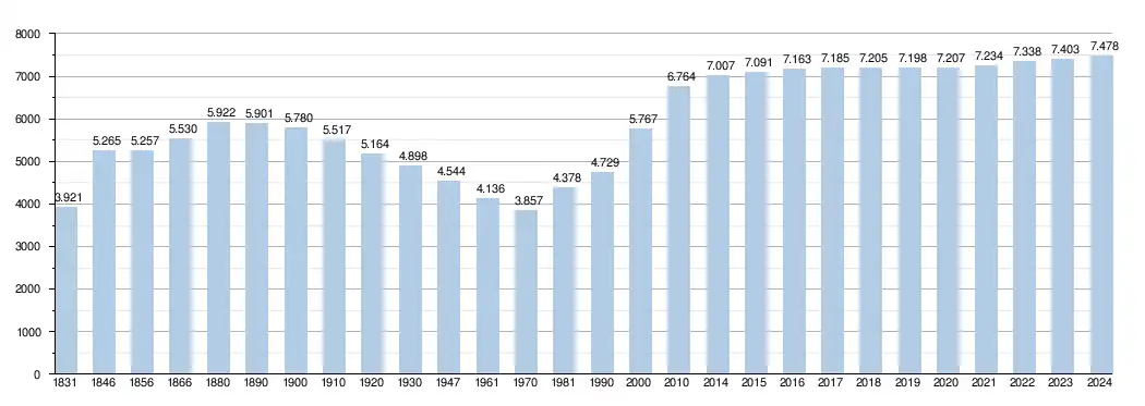 Les chiffres des années 1831 à 1970 tiennent compte des chiffres des anciennes communes fusionnées.