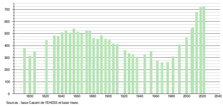 L'évolution du nombre d'habitants est connue à travers les recensements de la population effectués dans la commune depuis 1793. Pour les communes de moins de 10 000 habitants, une enquête de recensement portant sur toute la population est réalisée tous les cinq ans, les populations légales des années intermédiaires étant quant à elles estimées par interpolation ou extrapolation[16]. Pour la commune, le premier recensement exhaustif entrant dans le cadre du nouveau dispositif a été réalisé en 2007[17].