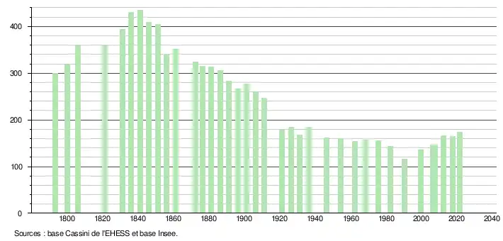 L'évolution du nombre d'habitants est connue à travers les recensements de la population effectués dans la commune depuis 1793. Pour les communes de moins de 10 000 habitants, une enquête de recensement portant sur toute la population est réalisée tous les cinq ans, les populations légales des années intermédiaires étant quant à elles estimées par interpolation ou extrapolation[16]. Pour la commune, le premier recensement exhaustif entrant dans le cadre du nouveau dispositif a été réalisé en 2007[17].