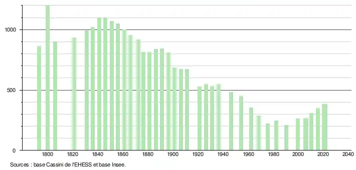 | L'évolution du nombre d'habitants est connue à travers les recensements de la population effectués dans la commune depuis 1793. Pour les communes de moins de 10 000 habitants, une enquête de recensement portant sur toute la population est réalisée tous les cinq ans, les populations légales des années intermédiaires étant quant à elles estimées par interpolation ou extrapolation[31]. Pour la commune, le premier recensement exhaustif entrant dans le cadre du nouveau dispositif a été réalisé en 2005[32]. En 2021, la commune comptait 383 habitants[Note 5], en augmentation de 9,12 % par rapport à 2015 (Haute-Garonne : +7,43 %, France hors Mayotte : +1,84 %). |