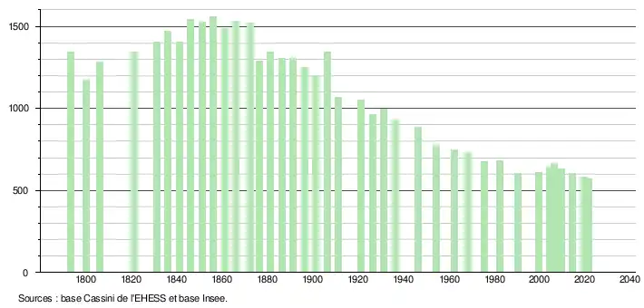 L'évolution du nombre d'habitants est connue à travers les recensements de la population effectués dans la commune depuis 1793. Pour les communes de moins de 10 000 habitants, une enquête de recensement portant sur toute la population est réalisée tous les cinq ans, les populations légales des années intermédiaires étant quant à elles estimées par interpolation ou extrapolation[14]. Pour la commune, le premier recensement exhaustif entrant dans le cadre du nouveau dispositif a été réalisé en 2004[15].