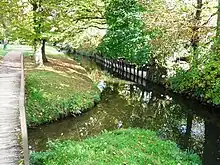 Dans le hameau de Courcelle-sur-Yvette, elle est rejointe par un affluent en rive droite, le Vaugondran, ruisseau des Fonds ou ru de Jaumeron en aval, puis enserre une petite île et alimente plusieurs petits étangs du parc de la Maison blanche. À proximité du Clos Rose, un vaste bassin de retenue des crues a été aménagé (bassin de Coupières, 200 000 m3)[10], obligeant la rivière à se séparer en trois bras distincts avant de se regrouper à la hauteur du Moulin de l’Abbaye.