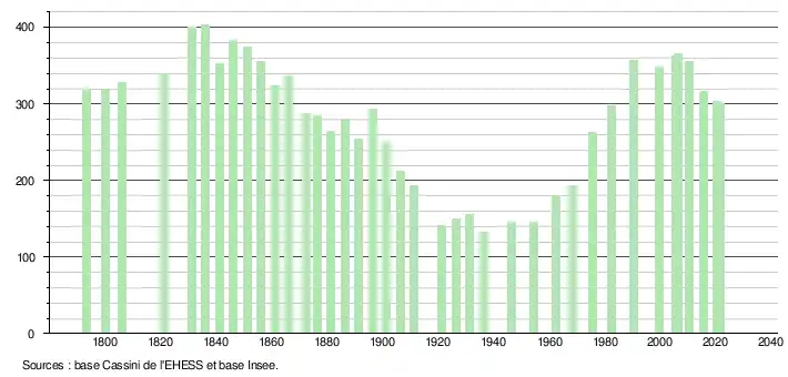 L'évolution du nombre d'habitants est connue à travers les recensements de la population effectués dans la commune depuis 1793. Pour les communes de moins de 10 000 habitants, une enquête de recensement portant sur toute la population est réalisée tous les cinq ans, les populations légales des années intermédiaires étant quant à elles estimées par interpolation ou extrapolation[27]. Pour la commune, le premier recensement exhaustif entrant dans le cadre du nouveau dispositif a été réalisé en 2005[28].