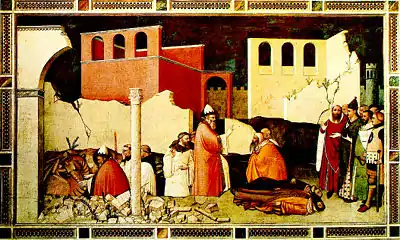 Le commanditaire est Mgr Teobaldo Pontano, en fonction de 1296 à 1329, et le travail couvre de nombreuses années, impliquant de nombreuses aides : Parente di Giotto, Maestro delle Vele et Palmerino di Guido (ce dernier mentionné avec le maître dans un document de 1309 où il s'engage à payer une dette). L'histoire est tirée de la Légende dorée de Jacopo da Varazze. Giotto fait bénéficier Assise des progrès réalisés à Padoue dans les solutions scénographiques et la spatialité, dans la technique et, surtout, dans la qualité de la lumière et des couleurs chaudes.
