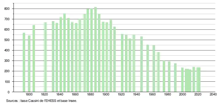L'évolution du nombre d'habitants est connue à travers les recensements de la population effectués dans la commune depuis 1793. Pour les communes de moins de 10 000 habitants, une enquête de recensement portant sur toute la population est réalisée tous les cinq ans, les populations légales des années intermédiaires étant quant à elles estimées par interpolation ou extrapolation[22]. Pour la commune, le premier recensement exhaustif entrant dans le cadre du nouveau dispositif a été réalisé en 2004[23].