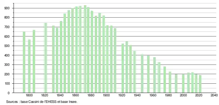 L'évolution du nombre d'habitants est connue à travers les recensements de la population effectués dans la commune depuis 1793. Pour les communes de moins de 10 000 habitants, une enquête de recensement portant sur toute la population est réalisée tous les cinq ans, les populations légales des années intermédiaires étant quant à elles estimées par interpolation ou extrapolation[26]. Pour la commune, le premier recensement exhaustif entrant dans le cadre du nouveau dispositif a été réalisé en 2006[27].