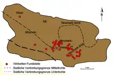 Alors que les plantes, et en partie aussi les invertébrés ont été trouvés dans tous les domaines des filons de lignite, les vertébrés sont reliés à des lieux définis, étroitement limités. En tout, on connaît plus de 80 sites, dont 36 présentent une proportion non négligeable de restes de vertébrés. Ceux-ci se trouvent principalement dans les filons inférieur et moyen, avec environ deux fois plus d'endroits dans le moyen que dans l'inférieur. Le filon supérieur ne comportait qu'un site de fouille intéressant, et était autrement largement dépourvu de fossiles, ce qui peut être rapporté aux transformations diagénétiques pendant le pléistocène sous l'action des conditions périglaciaires[9]. On n'a pu trouver aucune fossilisation dans le filon de base. La distribution spatiale des gîtes fossilifères de vertébrés reflète les conditions pour la conservation des fossiles, qui n'étaient pas uniformes dans l'ensemble du Geiseltal. C'est pourquoi la majeure partie des sites à vertébrés, et avant tout de ceux à squelettes ou parties molles largement préservés, se concentre dans le Geiseltal centre et sud, principalement près du seuil principal de Neumark, et dans la cuvette de Wernsdorf qui le jouxte à l'est. Le plus grand nombre de sites se trouve donc dans les mines à ciel ouvert Cecilie, Leo, Geiselröhlitz et Pfännerhall, s'étendant sur une surface de 20 km2 environ[13]. Vers le nord, l'ouest et en partie l'est, la qualité de la conservation des fossiles diminue considérablement[14],[15].